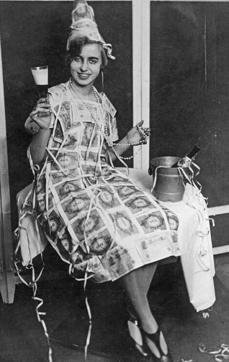 If nothing helps - get drunk… German woman wearing a dress made out of money during hyperinflation post World War I…