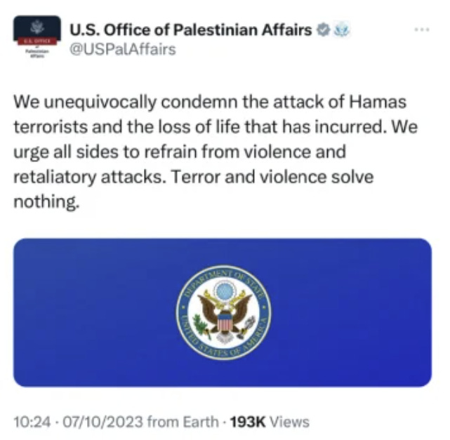 US Office of Palestinian Affairs tweeted that Israel should "refrain from retaliatory attacks" after the Palestinians launched 5000 missiles and terror teams on paragliders into Israel, killing hundreds of Israelis and wounding over a thousand…