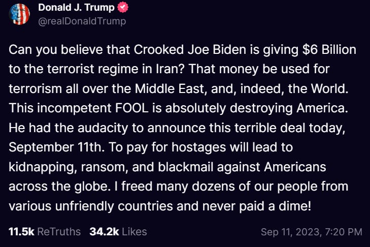 In summary, the Biden administration gave Iran money but it was specifically for toothpaste and baby food, not weapons. Our good, trustworthy friends in Qatar are providing oversight for the expenditures. There is simply no way for the money to be used for nuclear weapons or sending rockets to the Gaza strip. Plus, it's all America's fault that they hate us. If we're nice to them, they'll be nice to us. The chant has nothing to do with a medieval set of theocratic beliefs. Nothing…