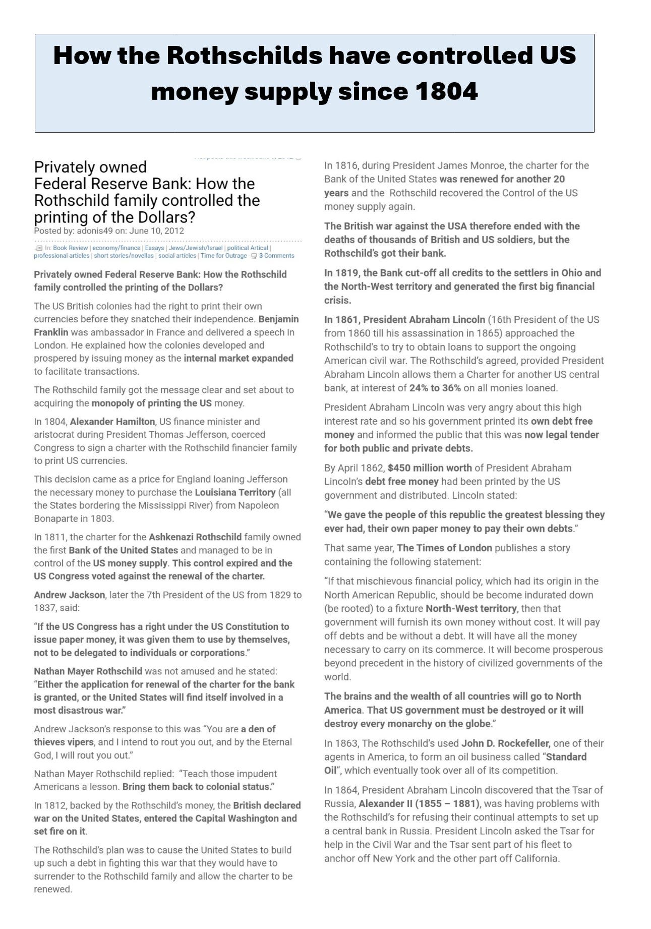 The Rothschilds have controlled US money supply since 1804 when Alexander Hamilton, US finance minister and aristocrat during Pres. Thomas Jefferson, coerced Congress to sign a charter with the Rothschild financier family to print US currencies. The Rothschilds did the War of 1812 to keep $ control… Then they created the Federal Reserve in 1913. The rest is history. Now we are all financial slaves to the Rothschilds. Also, the Rothschilds ran the Epstein/Maxwell operation and run the US government and CIA/Mossad