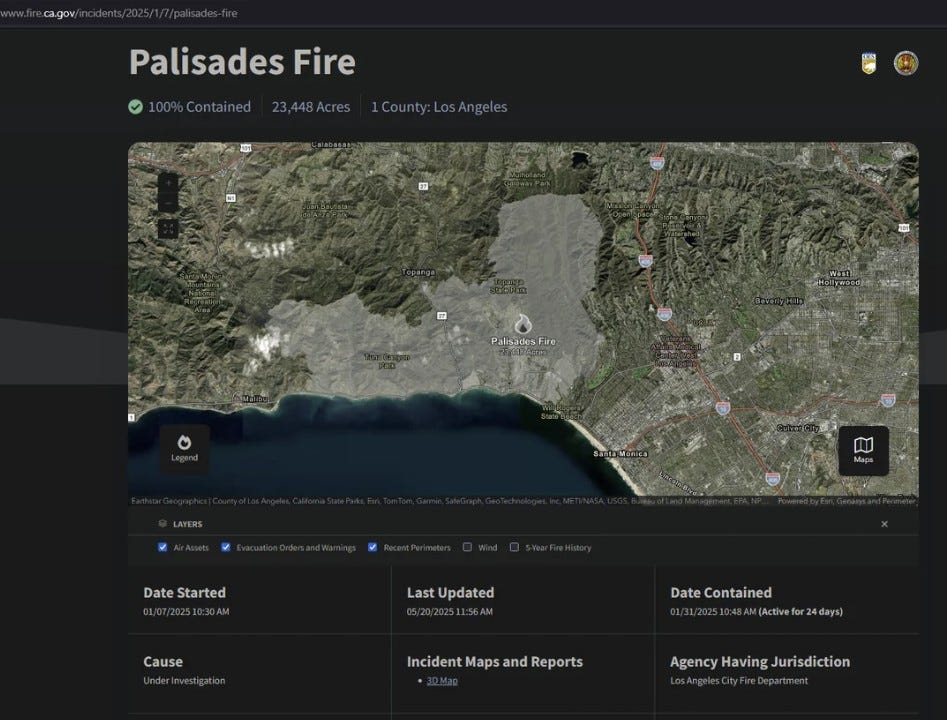 The cause of the Palisades fire is still "Under Investigation" per CA gov and is making slow progress…