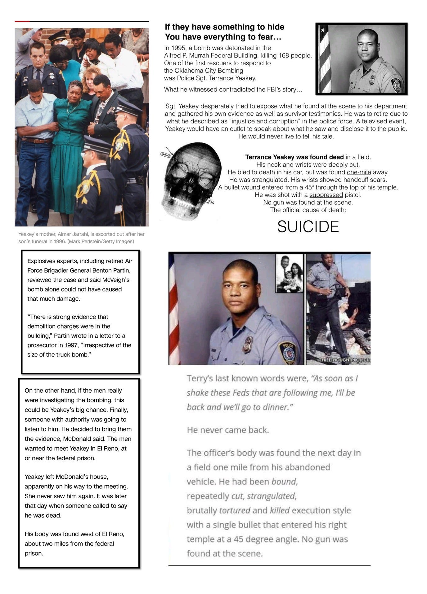 The story regarding Officer Terreance Yeakey and his Oklahoma City bombing investigation and his death at the hands of some crooked government agents is typical in the extreme of what is wrong with America and has been for decades. It is this kind of story that makes me ashamed to be living under the tyranny of a government our of control that has overthrown America from within and no one has the stones to stop it. The January 6 travesty of justice is just one more nail in the coffin proving that America been overthrown from within and unless the American people are prepared to take their government back from the corruption of the tyranny we face every day in this country, it will continue and the republic is dead, and the lies of a runaway corrupted government that Democrats and Rino Republicans alike call a Democracy will continue. I stood up to government in 2001, 2002, and 2003 and was wrongfully imprisoned by the runaway government of tyrants for a 6 year prison sentence in Colorado. You can google "Rick Stanley Activist" to see the actions against me and thereby, against the American people by extension. One man against the corrupted system that has overthrown this nation. After 20 some years, all long forgotten by America, but the rape of America continues in the Police State of Amerika. In those days when I ran as a Libertarian US Senate candidate from Colorado, I was considered too radical and too extreme, but my message about a runaway government that violates the rights of Americans with impunity continues through the events of today and the coming future, as I predicted would happen and I was ignored. The events of the last 22 years have proven my warning and America suffers deeply. It is much worse than anyone will admit. However, I know the truth. Each of you do as well, even if you are in denial, as 99% of America continues to be... The efforts of patriots the last 250 years has been tarnished by the events that continue to destroy freedom and liberty under a Constitution that has been corrupted to the point it is no longer something that Americans can point to with pride of commitment as a nation that upholds those principles long abandoned and covered up by the lies of government and politicians that will not adhere to the oaths that each swore to uphold. My comment: SHAME on Americans for not having the courage to stand up to tyranny and REPLACE what has been erected as an abomination to the memory of all the Americans who have fought for freedom and liberty for 250 years, all for naught, and tossed into the trash heap of history. Unfortunate, the spirit of America died with nary a whimper.