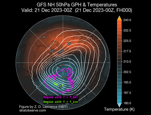December outbreak of Polar Stratospheric Clouds over Europe explanation: The polar vortex can wobble like a top, and in December it was displaced towards Europe. You can see this in the figure, below: