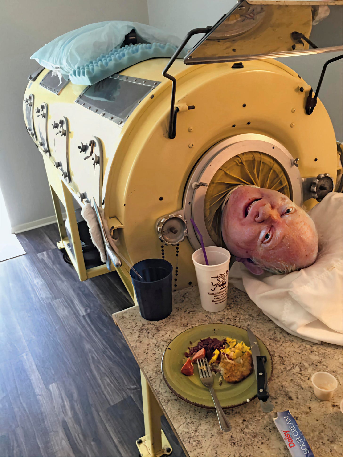One of the last People to live in an Iron Lung. At 6 years old, Alexander was diagnosed with Polio which lead to paralysis from his neck down.The machine is made to compress and depress the chest. Today, he is 74 years old and he still relies on the Iron Lung to keep him alive… At least he looks happy!