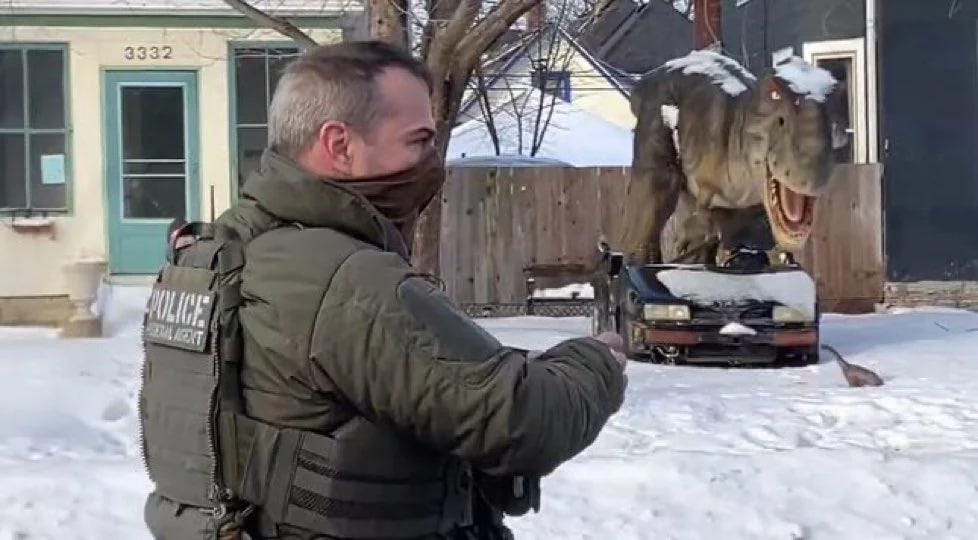 Yes, there is literally a giant T-Rex statue visible in the background of a crime scene video — and nobody noticed.