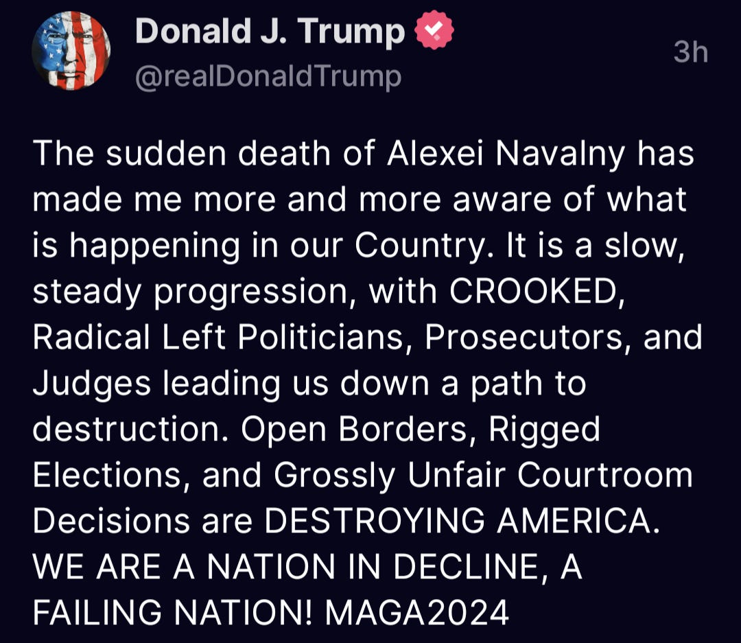 Would it have killed you to make two separate posts? One to memorialize Alexei Navalny and his life's work to have a better functioning democracy or republic in Russia, and the other to grind your political axes against the current Administration…