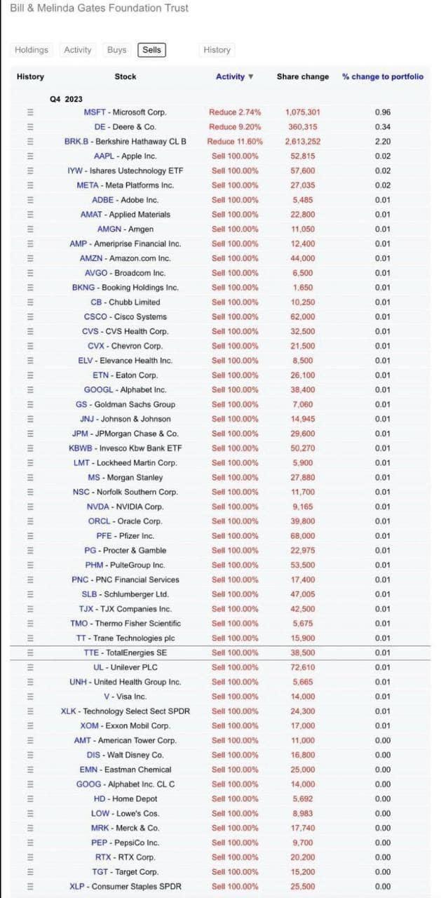 Big sale my ass! Did you note that all of these sells account for less than 4% of the portfolio of Gates… In other words, most of these trades are irrelevant to the size of his overall portfolio. Imagine if you had a trading account with $100k in it and sold $10 of stock because that's what a 0.01% trade is…