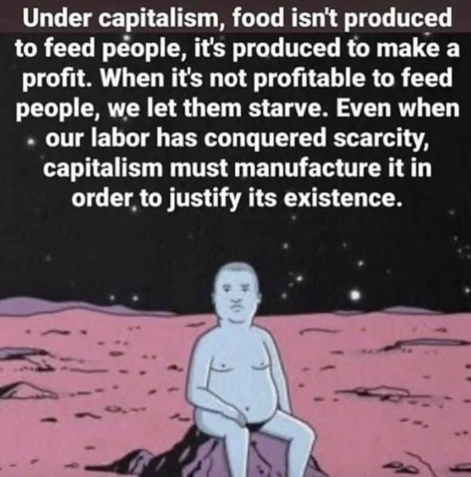 Scarcity? “Each year, 119 billion pounds of food is wasted in the United States. That equates to 130 billion meals and more than $408 billion in food thrown away each year. Shockingly, nearly 40% of all food in America is wasted.” Nice, isn’t it?