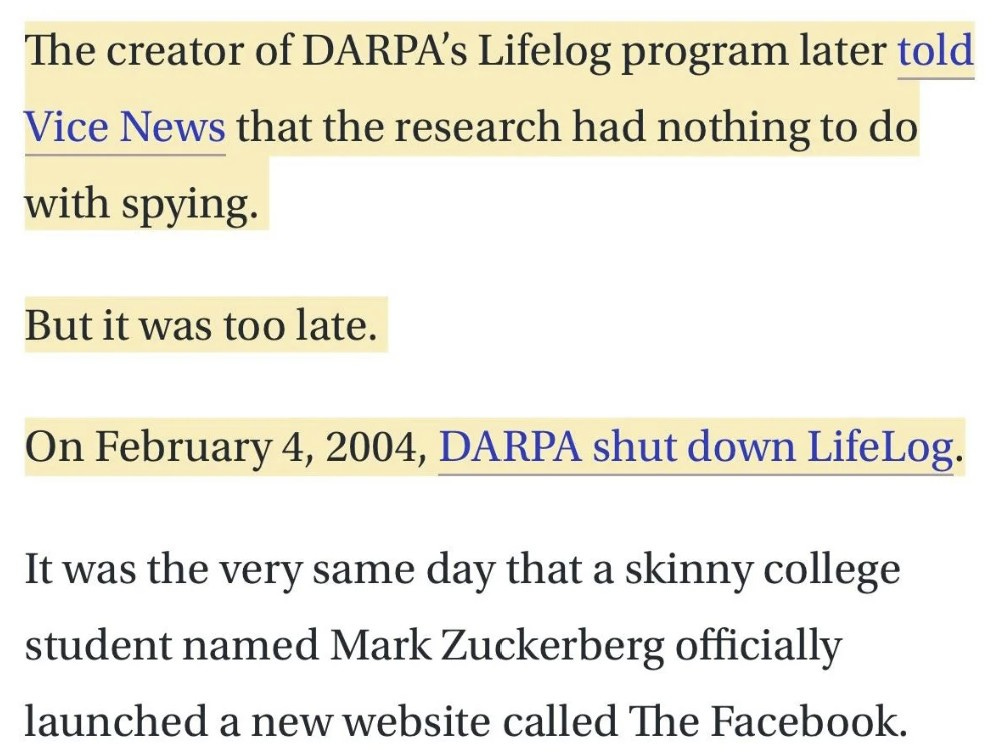 Btw, Facebook is a DARPA program called Lifelog. Why do we pretend that Zuck is in charge of anything?