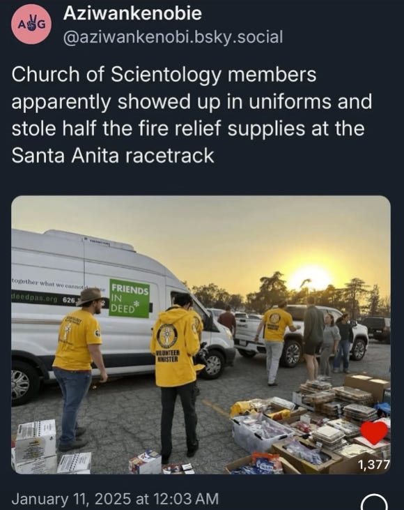 Tom Cruises' and Will Smith’s Scientologists just stole half of Fire Relief Supplies… Freakin terrible…