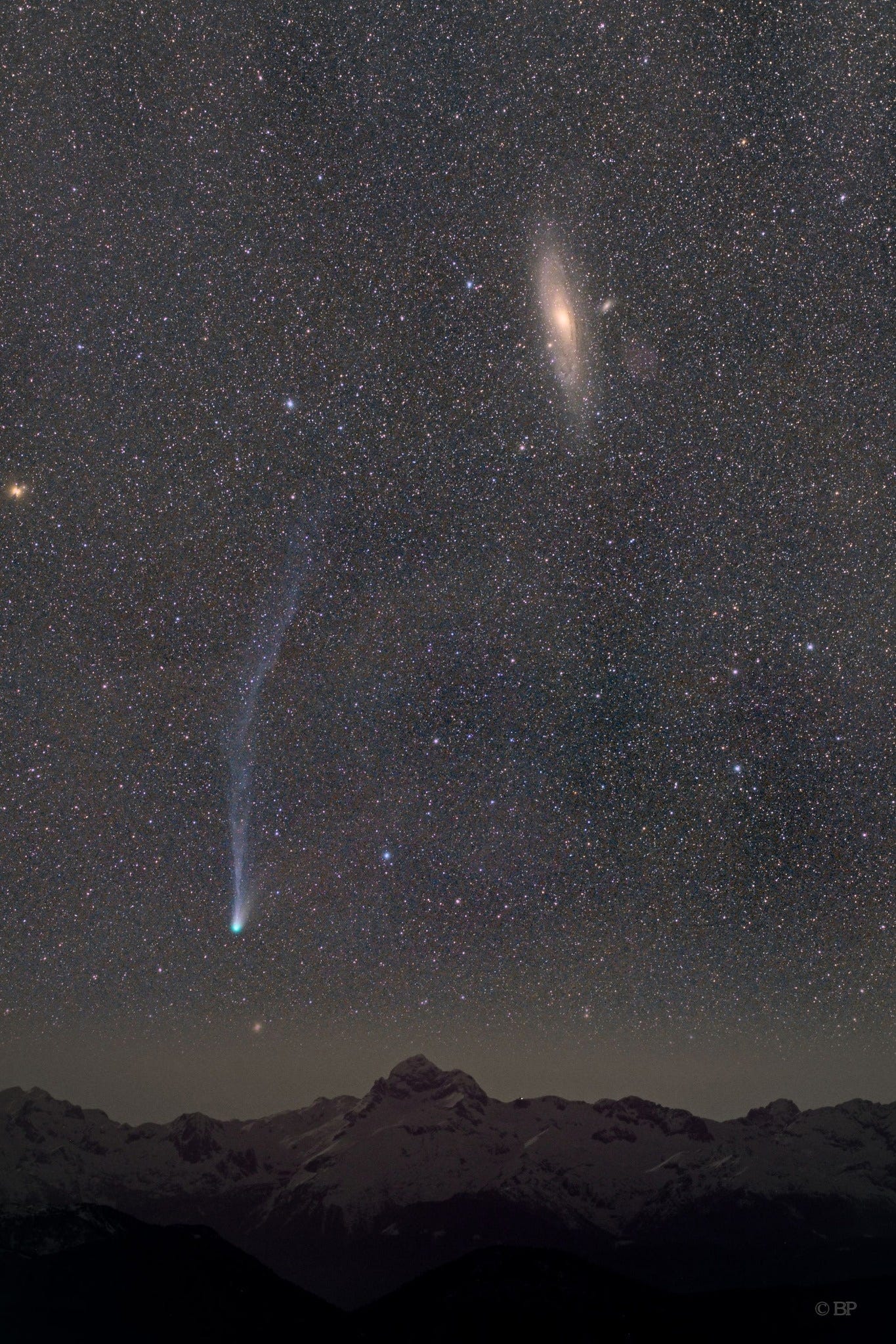Comet Pons-Brooks (12P/Pons-Brooks) and the Andromeda Galaxy over the mountains of Slovenia, March 2024. Photographer: Borut Prasnikar…