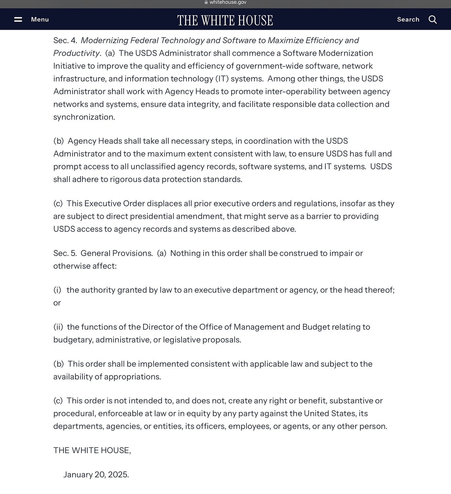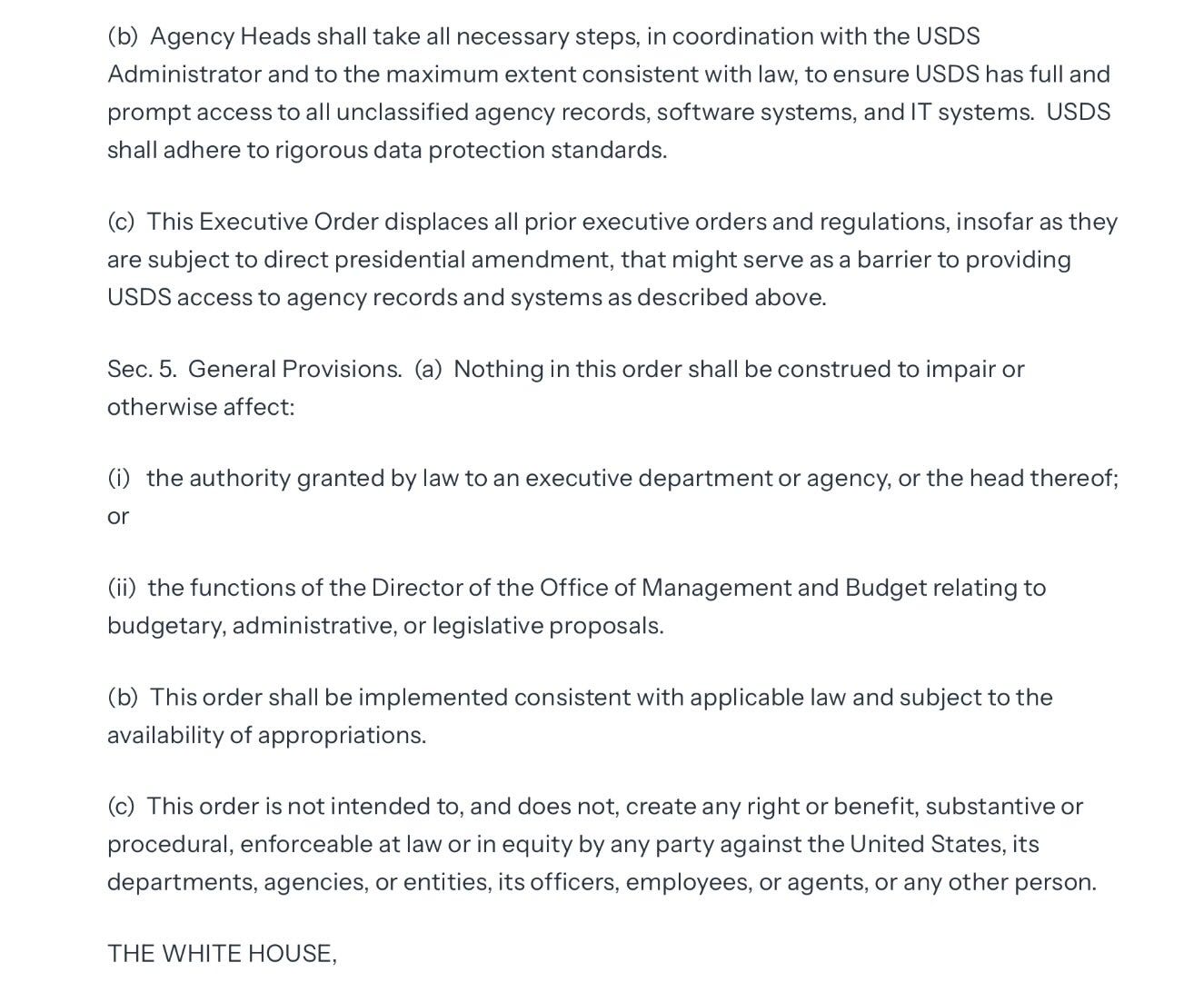 The last part of the post is all important boilerplate. Trump orders all agencies to support the DOGE initiative, disclaims any other prior EOs that could interfere with this order, and makes a conflict of laws statement. This was further insulation to make this harder for political opponents to fight in court.