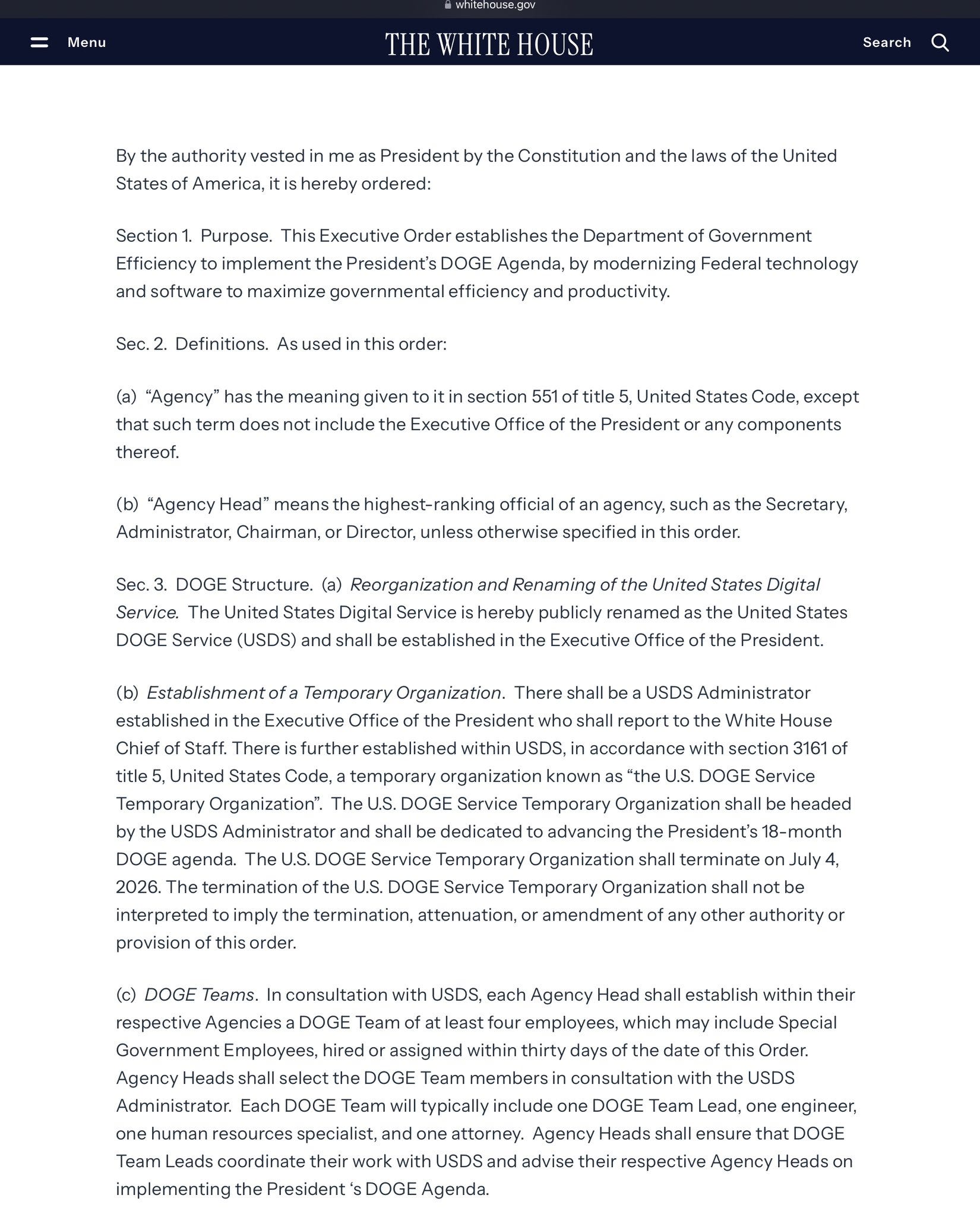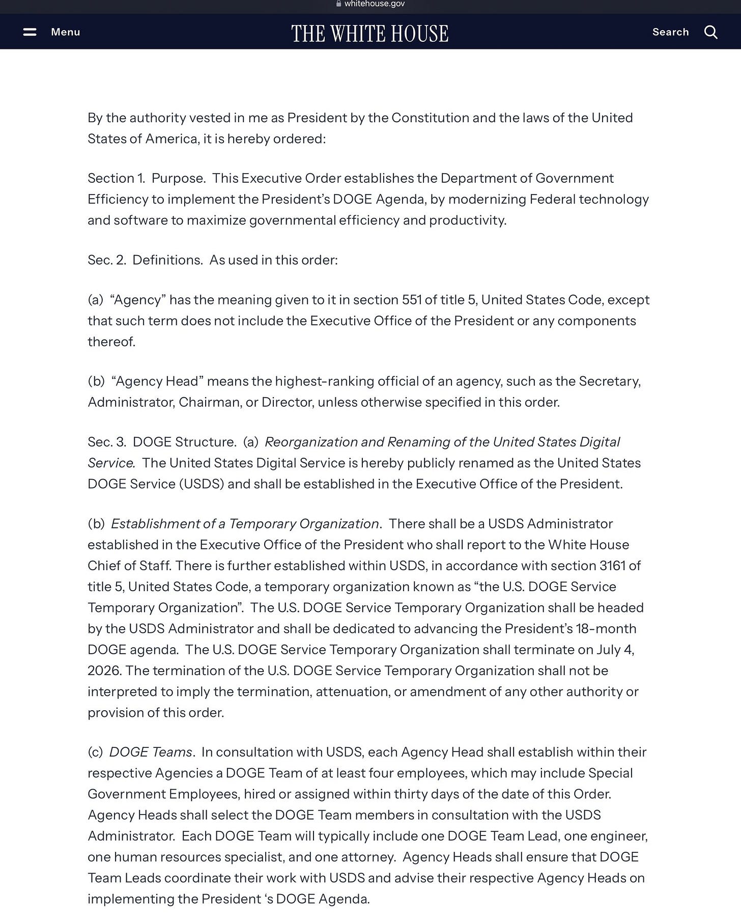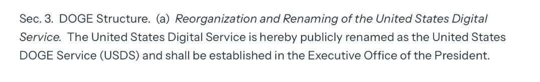 As you can see this document is barely 2 pages and certainly not written in legalise. While not a complicated read - the plan was brilliant. Trump did NOT actually create a new agency. Instead what he did was repurpose an existing agency - the USDS - into something more useful.