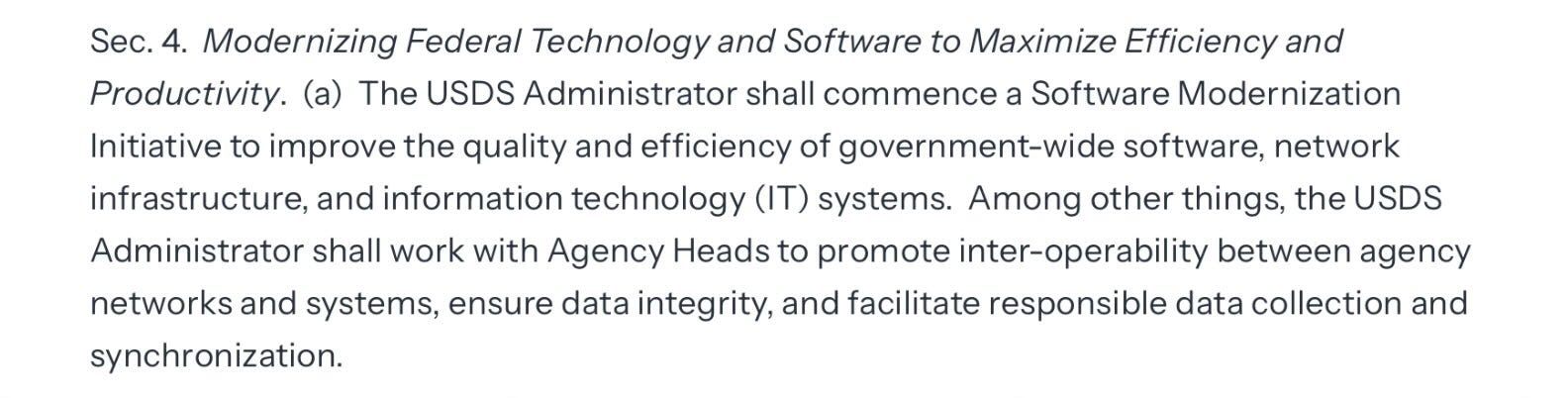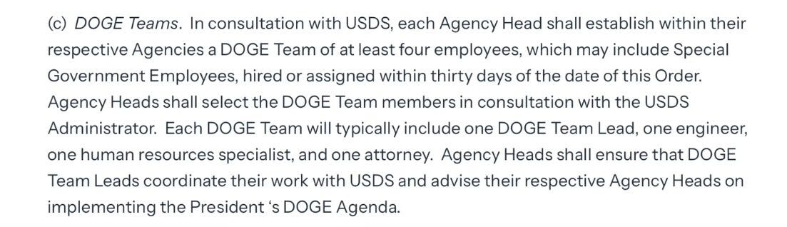 Trump also ordered that DOGE teams be hired in every administrative branch agency. These teams are to include a team lead, a lawyer, an HR person, and an engineer. These teams work for USDS (DOGE) but work with and within various agencies. While all this is part of a “software modernization initiative,” looking at the software and how things are managed is a great way to find out where there is waste - particularly when part of the mandate it to ensure efficiency.