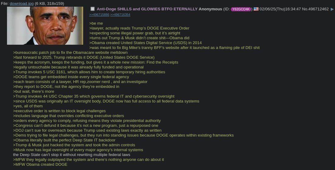 The USDS was an Obamacare office created to make government software better. They were essentially software development for the bureaucracy. Trump renamed the United States Digital Service (USDS) the United States DOGE Service which even kept the acronym the same. Not only did repurposing an appropriate existing department allow Trump to ensure there was funding for DOGE without having to fight with Congress - he also ensured its legality.