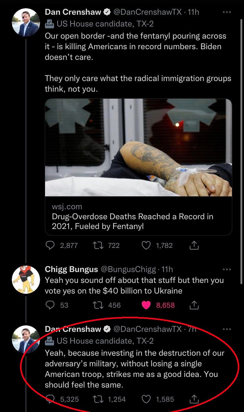Dan Crenshaw admits Ukraine support is about a proxy war with Russia on Twitter. Conspiracy theorists proven right again…