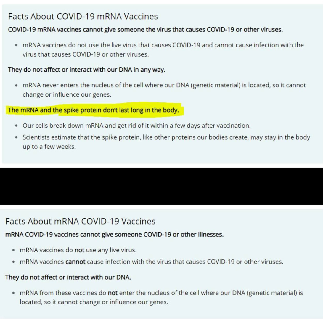 The CDC removed the section "The mRNA and the spike protein don’t last long in the body" and made important changed to "mRNA never enters the nucleus of the cell". Archives: Before and After…