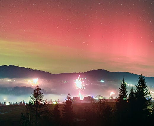 As predicted, a CME struck Earth's magnetic field on Dec. 31st (1621 UTC). The strike sparked strong geomagnetic storms and auroras well outside the Arctic Circle. Below, a picture from Oravska Lesna, Slovakia with fireworks: