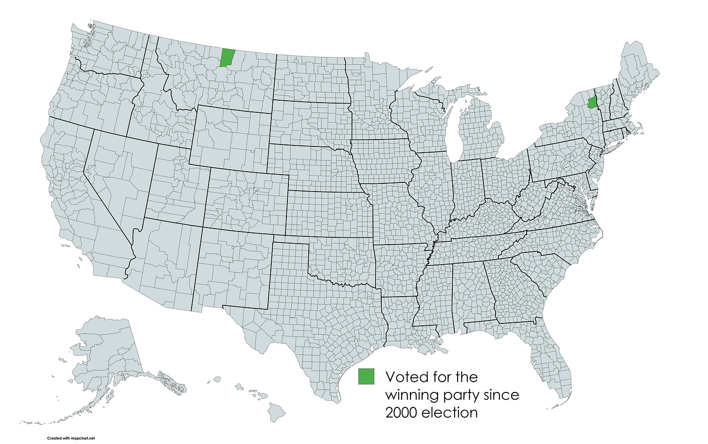 The only counties that voted for the winning party since the 2000 U.S. Presidential General Election, Blaine, MT, and Essec, NY…