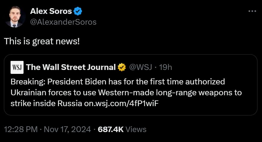 But yes, in just 24 hours we went from "Zelensky says Ukraine must do all it can for war to end next year through diplomacy" to "Ukraine uses US long-range missile strikes"…