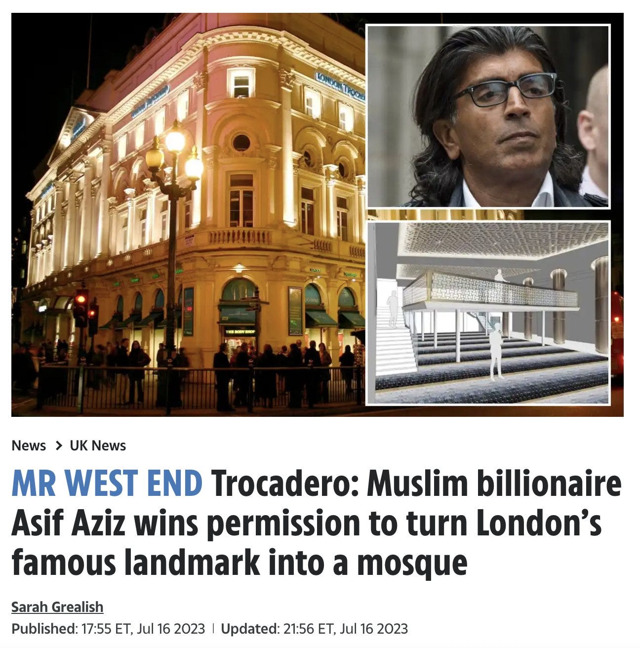 A Muslim billionaire has won permission to turn a major London landmark into a mosque. The Trocadero, between Picadilly Circus and Soho, opened in 1896 as a restaurant. Westminster Council has approved the plans for a three-storey mosque in the heart of London…