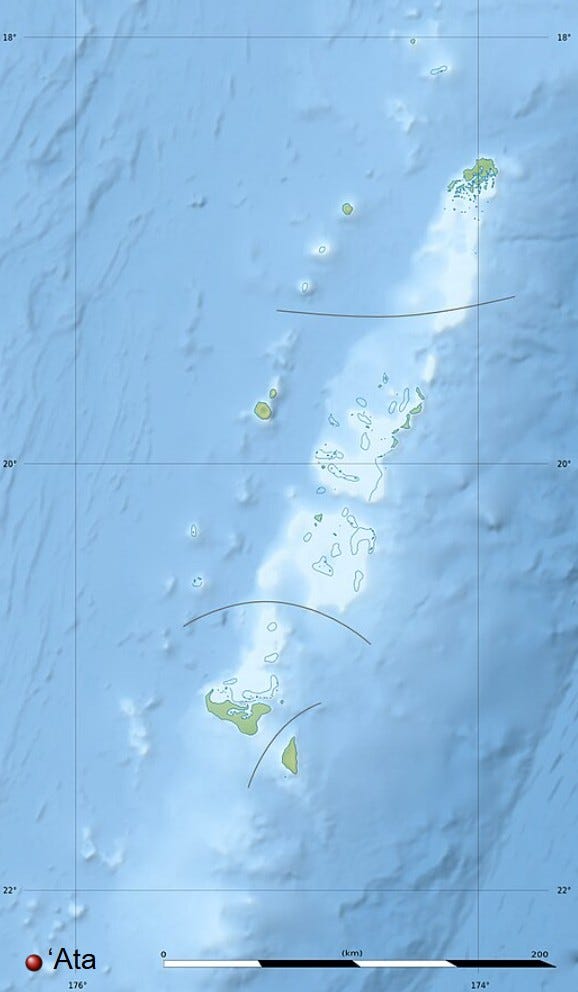 Just as hope seemed lost, they spotted land — the uninhabited island of 'Ata, a volcanic rock jutting out of the South Pacific, at the southernmost tip of the Tonga archipelago, about 160 kilometers southwest of Tongatapu.