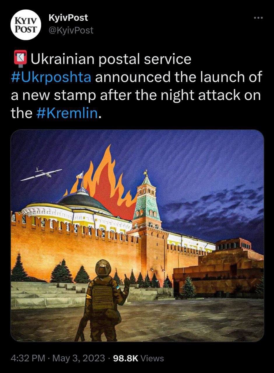 Kiev claims the Kremlin drone attack was a false flag committed by Russia, yet the Ukrainian Postal Service has made a commemorative stamp. I guess this is Ukraine taking credit for something they didn't do again?