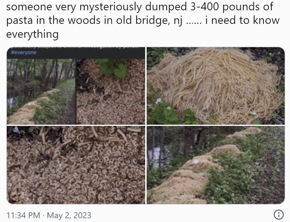 Hundreds of pounds of pasta were dumped in the New Jersey woods. But why? I love pasta!