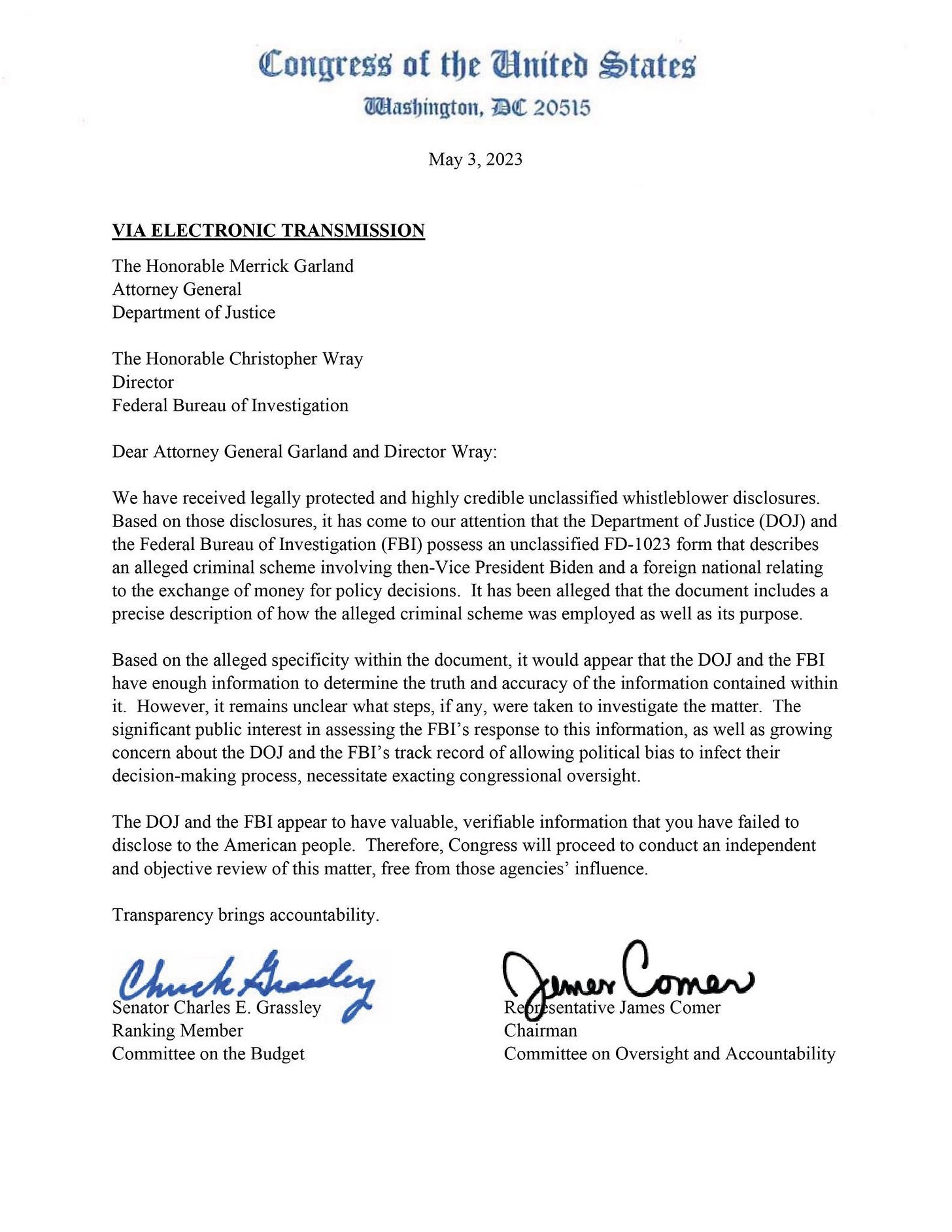 James Comer and Chuck Grassley have just released a statement claiming the FBI has proof showing then-Vice President Joe Biden committed bribery in exchange for policy decisions with a foreign national.