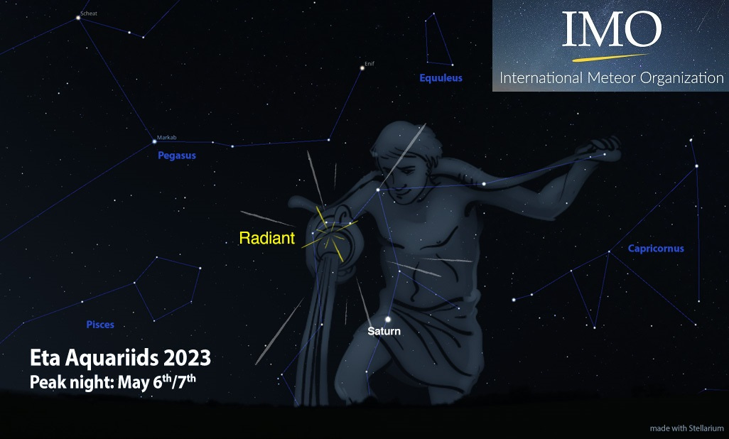 Earth is entering a stream of debris from Halley's Comet, source of the annual eta Aquariid meteor shower. Peak rates of 10 to 30 meteors per hour are expected on the night of May 6-7. Glare from a nearly full Moon will reduce visibility, but this could be offset by an extra dose of meteoroids nudged toward Earth by the gravity of Jupiter…