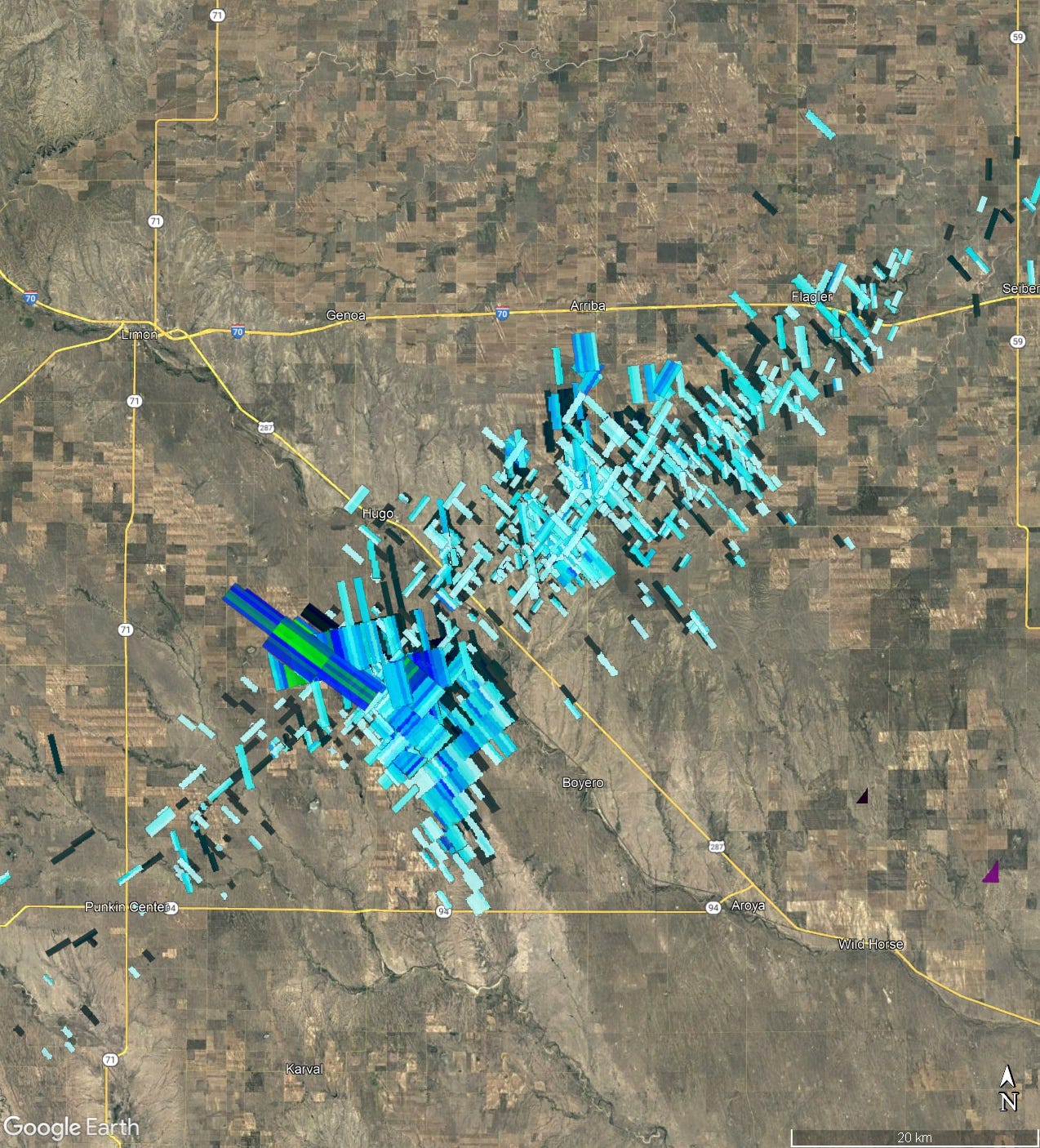 The reentry was detected by NEXRAD radar with a cluster of strong radar signatures southeast of the city of Limon, Colorado. Large fragments of the trunk may have landed near this site. This map shows where the debris might be located: