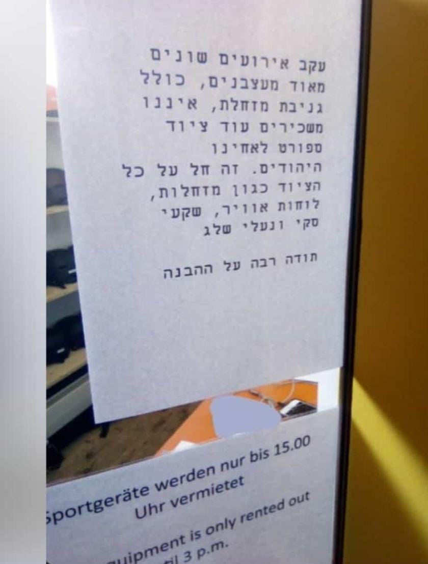 Jews are no longer allowed to rent sleighs in Davos, Switzerland… The sign, put on a window at a counter, reads: “After a series of annoying incidents, including the theft of a sled, we are no longer renting out sporting equipment to our Jewish brothers…”