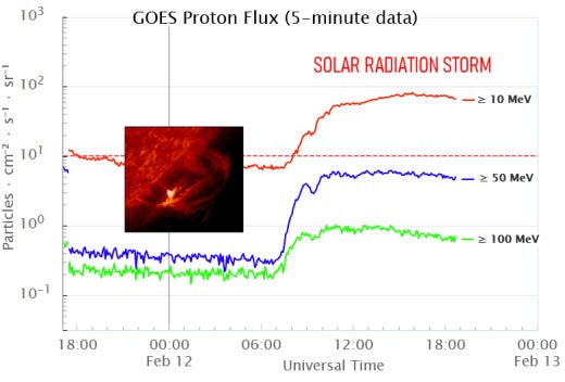 For the second time in less than a week, energetic solar protons are raining down on Earth's upper atmosphere. Forecasters call this a "solar radiation storm." Today's storm is rich in "hard protons" wiith energies greater than 50 MeV.