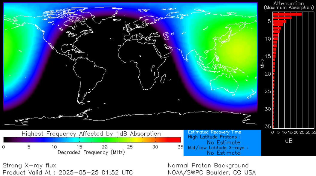 Radiation from the flare ionized the top of Earth's atmosphere, causing a brief shortwave radio blackout over the Pacific Ocean. Ham radio operators may have noticed a loss of signal strength at all frequencies below 20 MHz around 0200 UTC.
