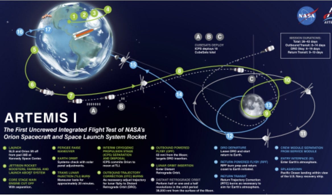 Over the course of its 42 day mission, Orion will orbit the Moon for more than a week (approaching the lunar surface within 62 miles) and travel 40,000 miles beyond the far side of the Moon before turning back to Earth.