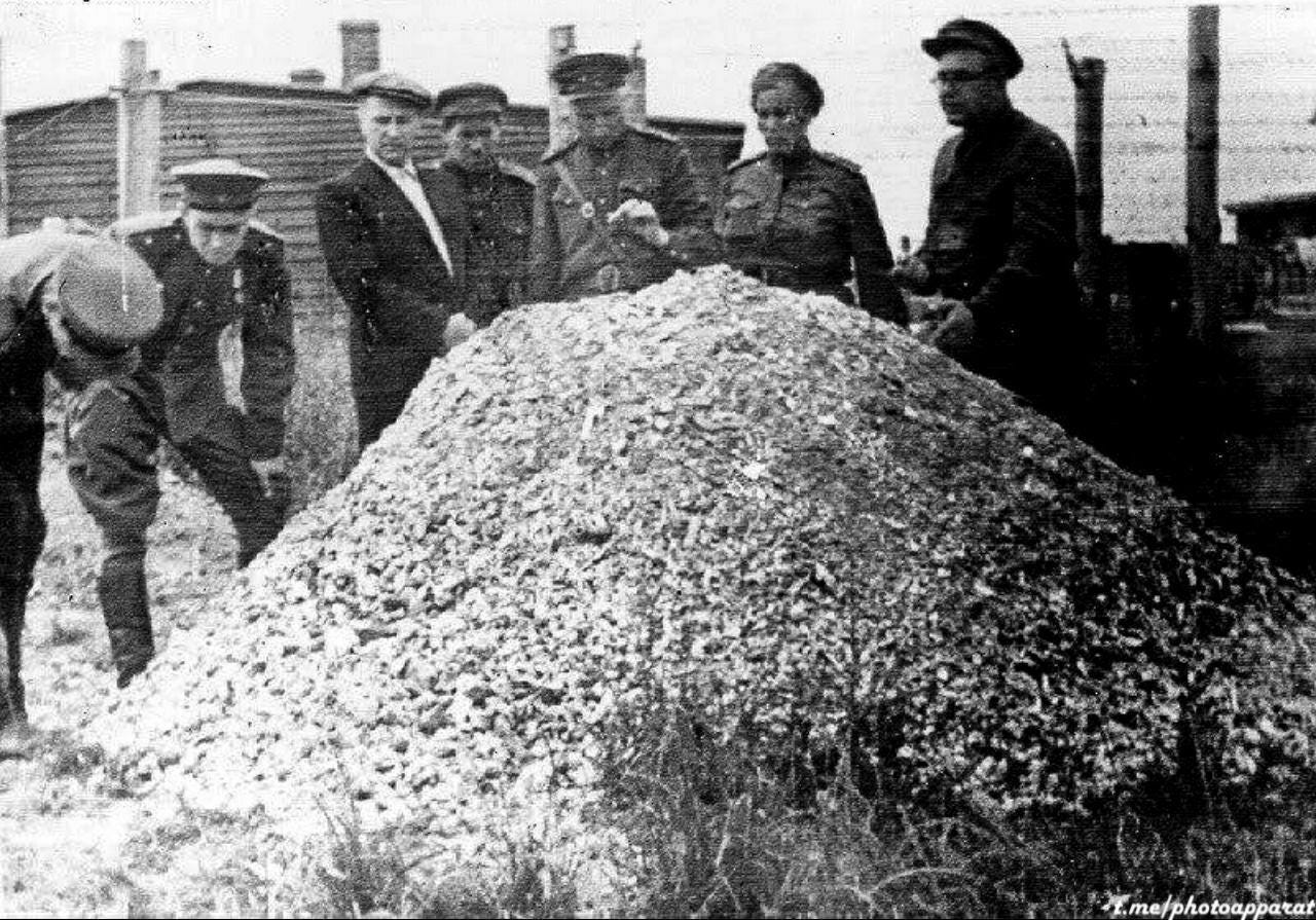 Those stunned Soviet officers examine a large pile of human ashes in front at Majdanek concentration camp, near Lublin, Poland. The camp was liberated by the Red Army in 1944… An even bigger pile of ashes can still be seen at Majdanek where they have been preserved and covered as a chilling memorial…
