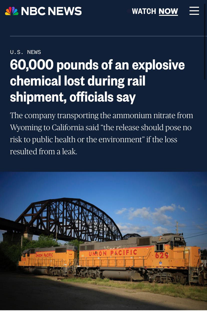Anybody remember the story about 60,000 pounds of ammonium nitrate going missing from a train en route to California? Wonder if that will turn up in the form of a multi-city false flag attack that will give the government justification for a war or a suspension of habeas corpus. What do you guys think?