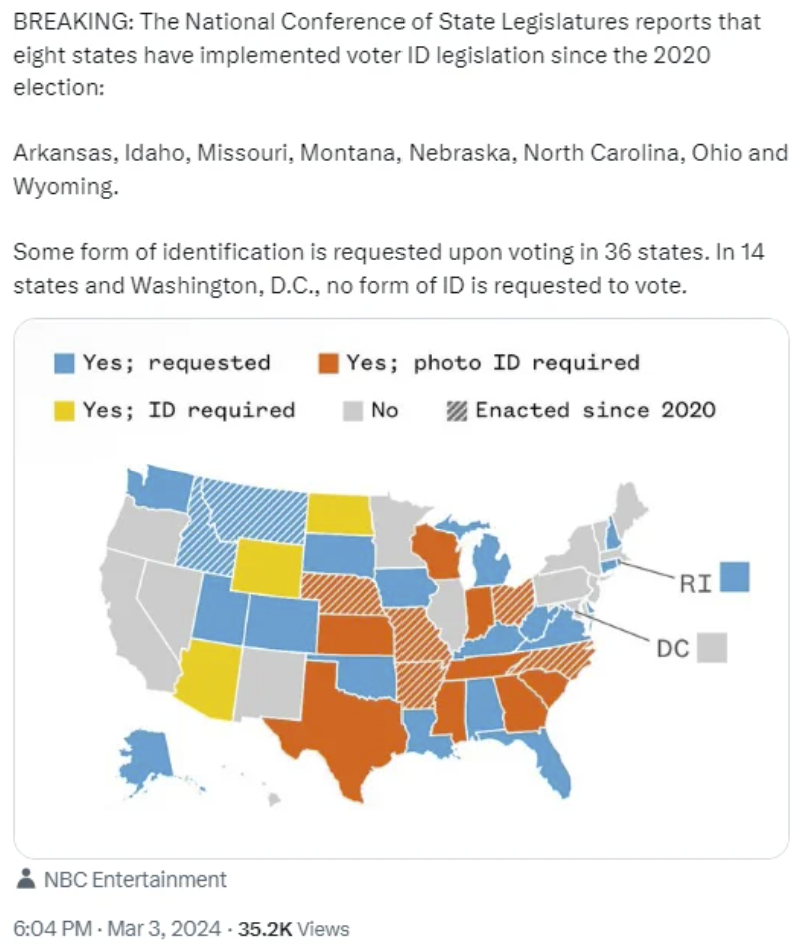 Interesting: In 14 states and Washington, D.C., no form of ID is requested to vote…