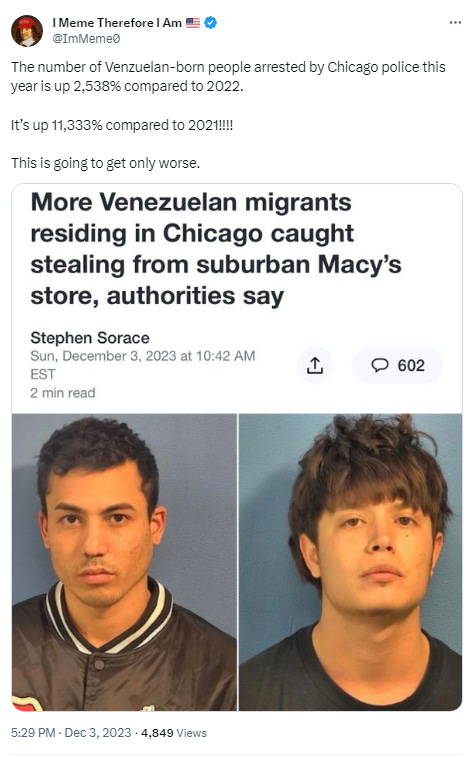 I was told that illegal immigrants enrich American lives and make us all wealthier… Arrests are up 11,333% compared to 2021…