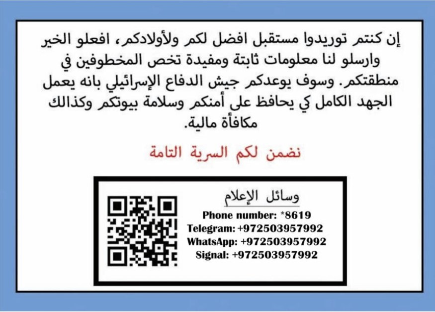 “If your will is to live in peace and to have a better future for your children, do the humanitarian deed immediately and share verified and valuable information about hostages being held in your area,” read the leaflets, written in Arabic and shared by the Israel Defense Forces.