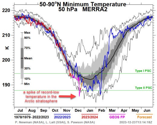 RECORD-COLD WEATHER IN THE STRATOSPHERE: Now we know why polar stratospheric clouds (PSCs) have suddenly exploded. According to NASA's MERRA-2 climate model, temperatures in the Arctic stratosphere just hit a 40-year record low for the month of December: