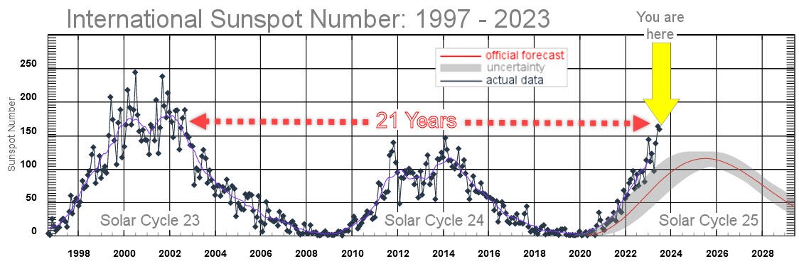 With Solar Max not expected for another year (or more), sunspot counts should continue to increase, further widening the gap between Solar Cycle 25 and its historically weak predecessor Solar Cycle 24. If, indeed, Solar Cycle 25 does leapfrog Solar Cycle 24 and land in the vicinity of Solar Cycle 23, we can expect at least 3 to 5 years of high solar activity in the years ahead…
