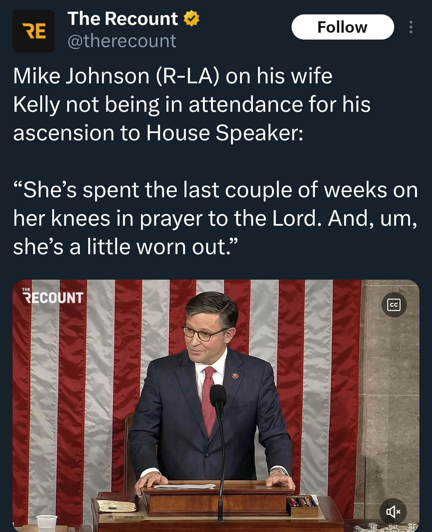 Mike Johnson’s wife is what we Christians call a prayer warrior. Please be more respectful of things you may not understand but are very powerful in our lives and in our relationship with God.