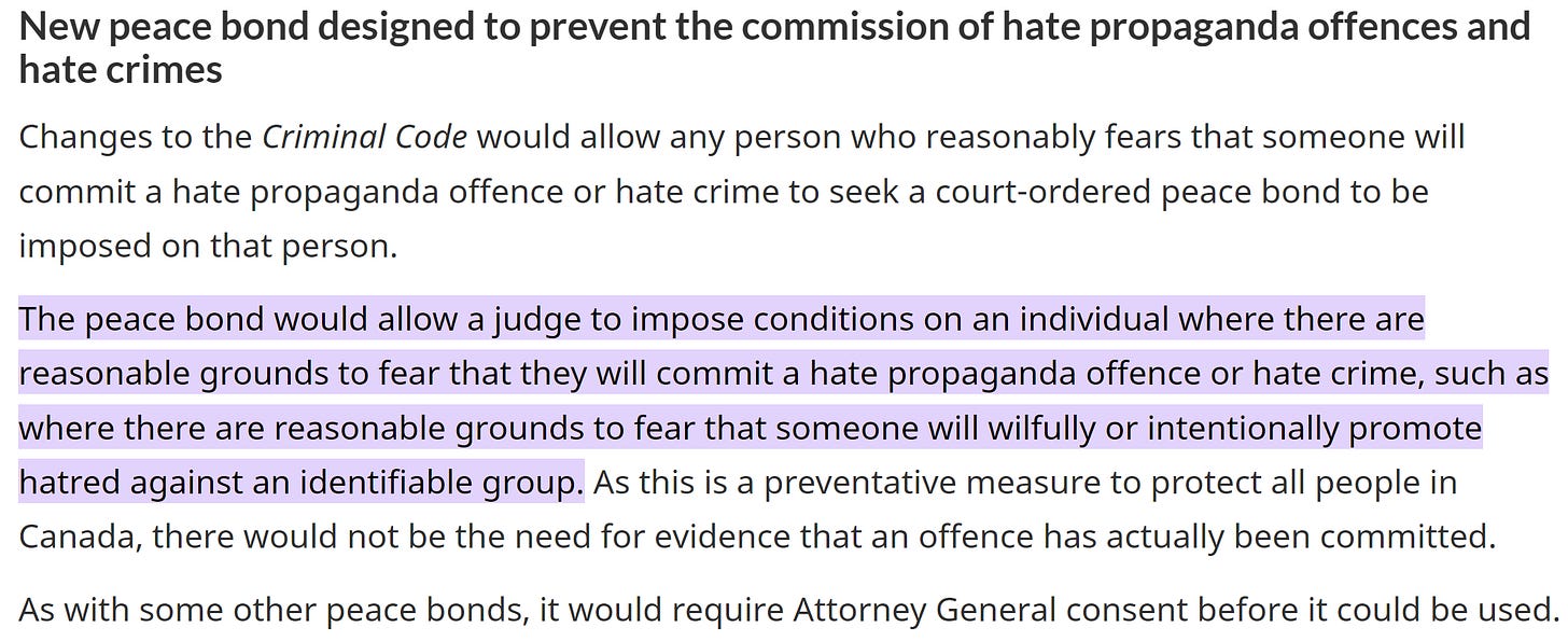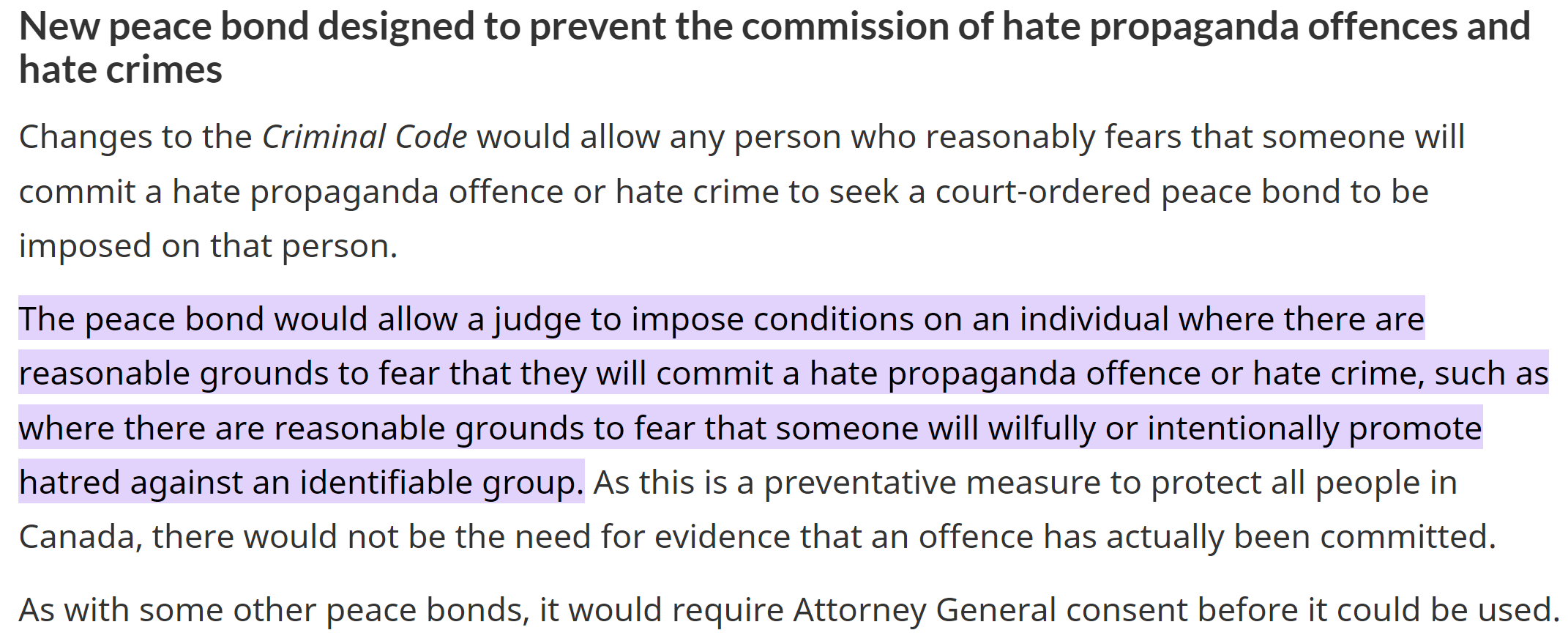 A proposed Canadian law would allow a judge to impose a "peace bond" to prevent someone from committing a "hate propaganda offence." "There would not be the need for evidence that an offence has actually been committed."