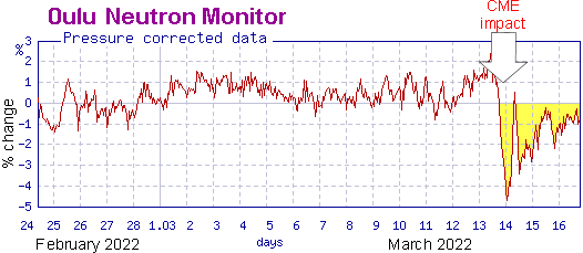 The March 13th CME did more than spark bright auroras. It also wiped out a lot of cosmic rays. Neutron monitors at the Sodankyla Geophysical Observatory in Oulu, Finland, recorded a sharp drop in cosmic radiation just after the CME arrived: