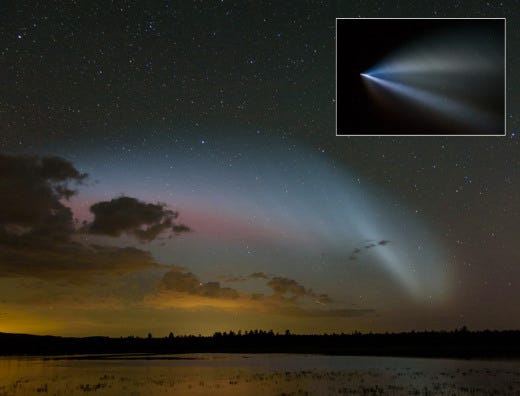 Note the red glow behind the clouds. This is a sign that the rocket punched a hole in the ionosphere. In our case, the "wound" was marked by a bright red glow (like an aurora)…