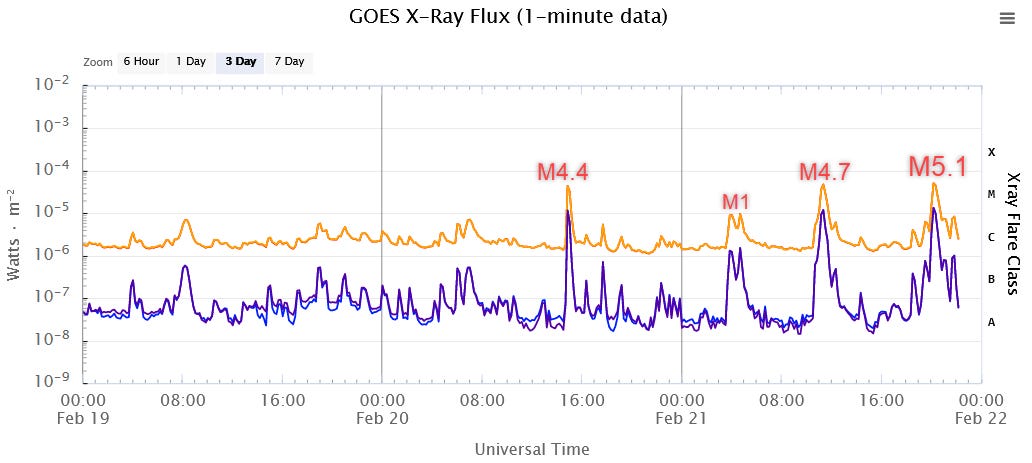 Sunspot AR3234 is crackling with solar flares including multiple M4- and M5-class events on Feb. 21st.