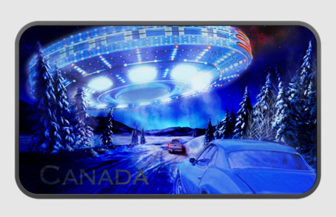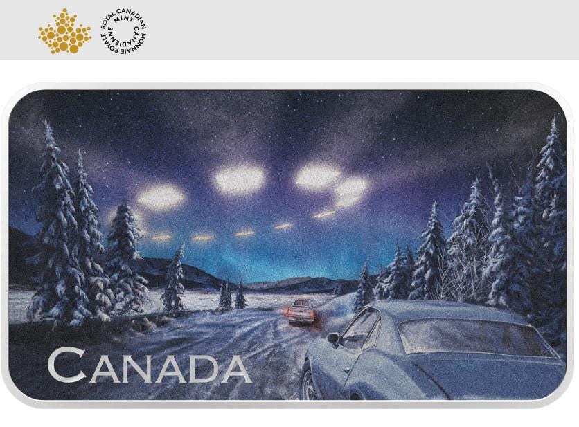Another step toward bringing the UFO subject into the mainstream consciousness. This square coin issued by the Royal Canadian Mint depicts a scene with the 1996 Yukon UFO sighting with a short description of the event on their web page.