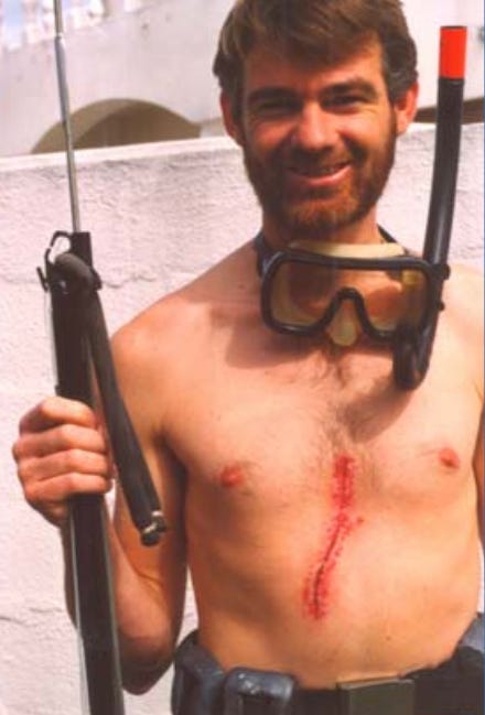South African spearfisherman, Gerjo van Niekerk, in Sep 1989, bearing a recent wound from a great white bite. 'It was a one-in-a-million freak accident' he told reporters. Just two months later, diving Melkbosstrand, van Niekerk disappeared- and a few days after his shark-bitten leg washed ashore…