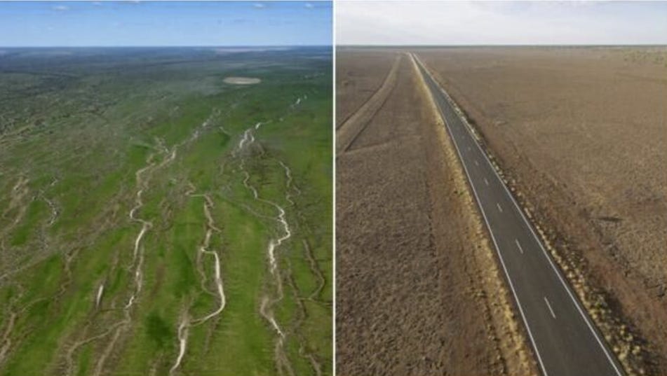 The iconic red dirt and vast brown plains of the west are now a bold carpet of green with grasslands regenerating, wildflowers in bloom and waterbirds, including pelicans and black swans, revelling in the lush conditions…